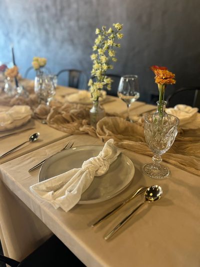 You can use all of our chargers, glass cups, and linen napkins as well.